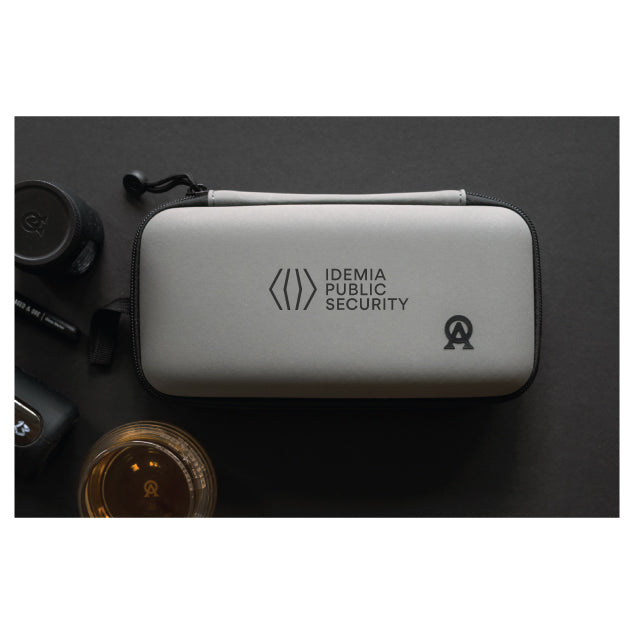 The Aged & Ore Bottle Flight is a premium set of 4 custom silicone wrapped glass bottles designed to transport and share samples of your favorite spirits. The flight bottles come in a custom EVA travel case that fits perfectly in any small bag. Idemia Public Security laser etched on top of case.